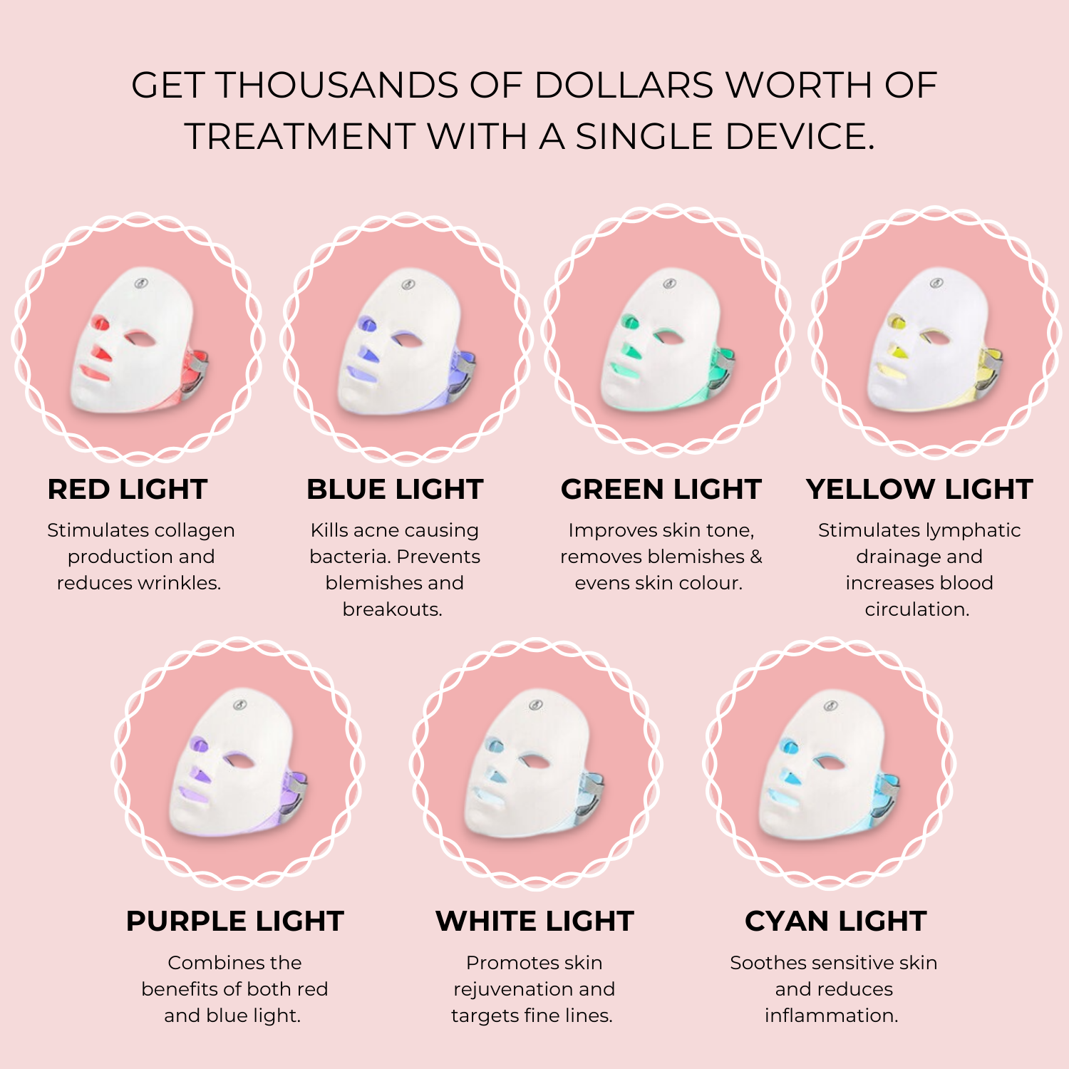 Choose from 7 different LED lights, which have been clinically proven to enhance skin texture, reduce wrinkles, combat acne and much more.