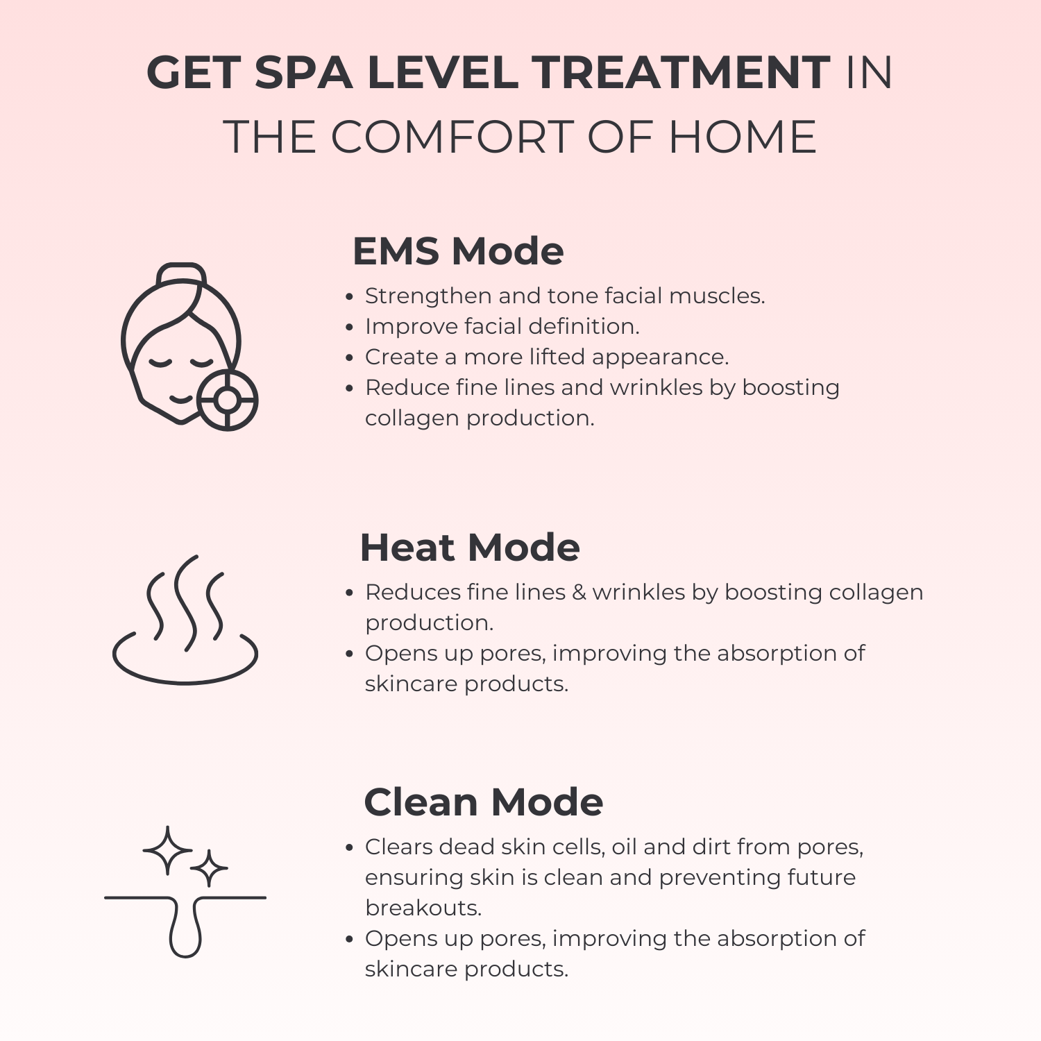 Three different modes come with our device including the Clean Mode, which helps to keep your skin fresh and unclog pores, EMS Mode, which delivers low-level electrical currents to tone and firm your face, and Heat Mode to further promote collagen production and enhance skin elasticity.